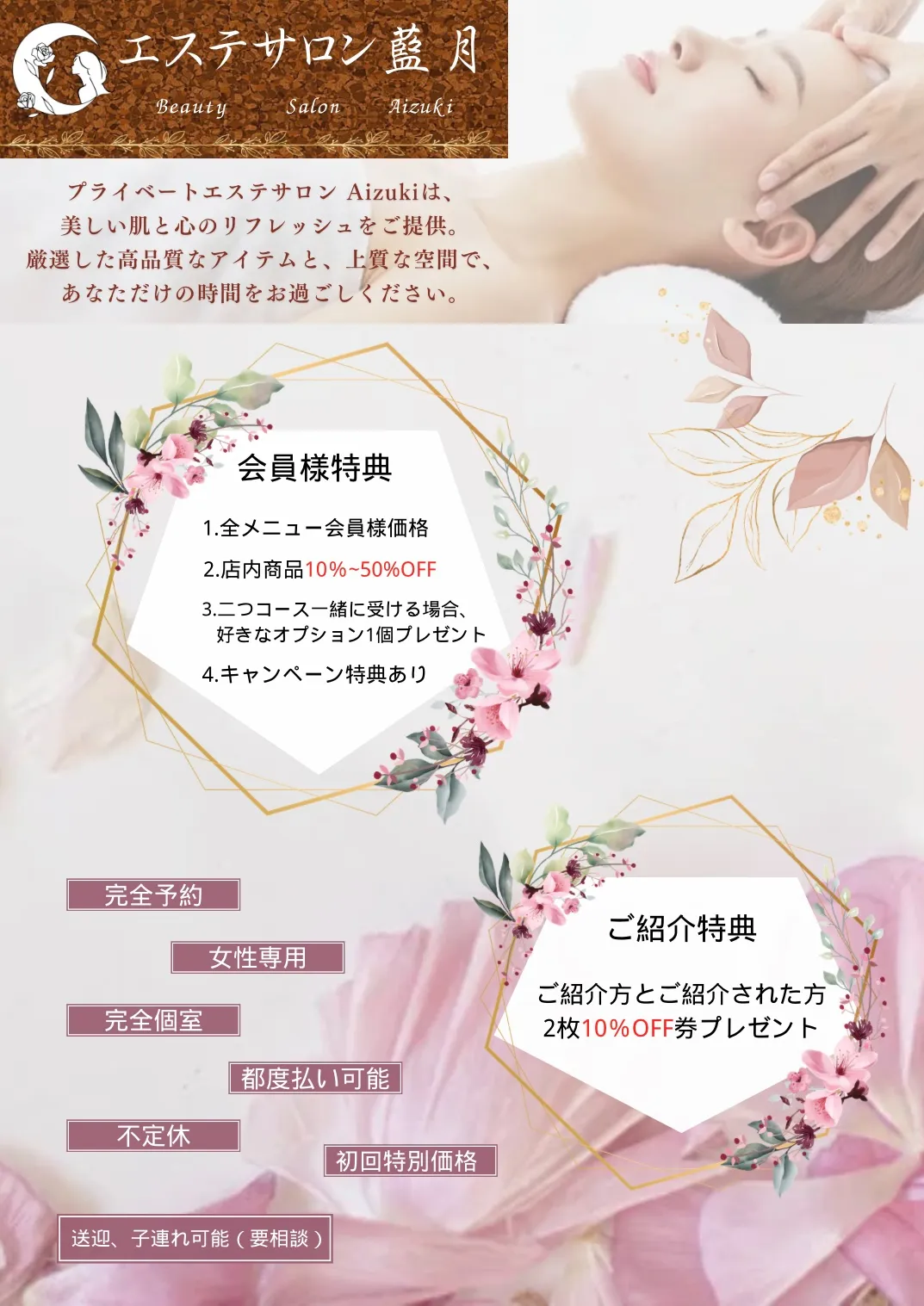2018年の開業以来、7年にわたり地域の皆様に愛され続けてきた当サロン。フェイシャルエステ、デトックスケア、アロマトリートメント、まつ毛エクステンションまで、美と癒しのすべてを一つの空間でご提供しています。